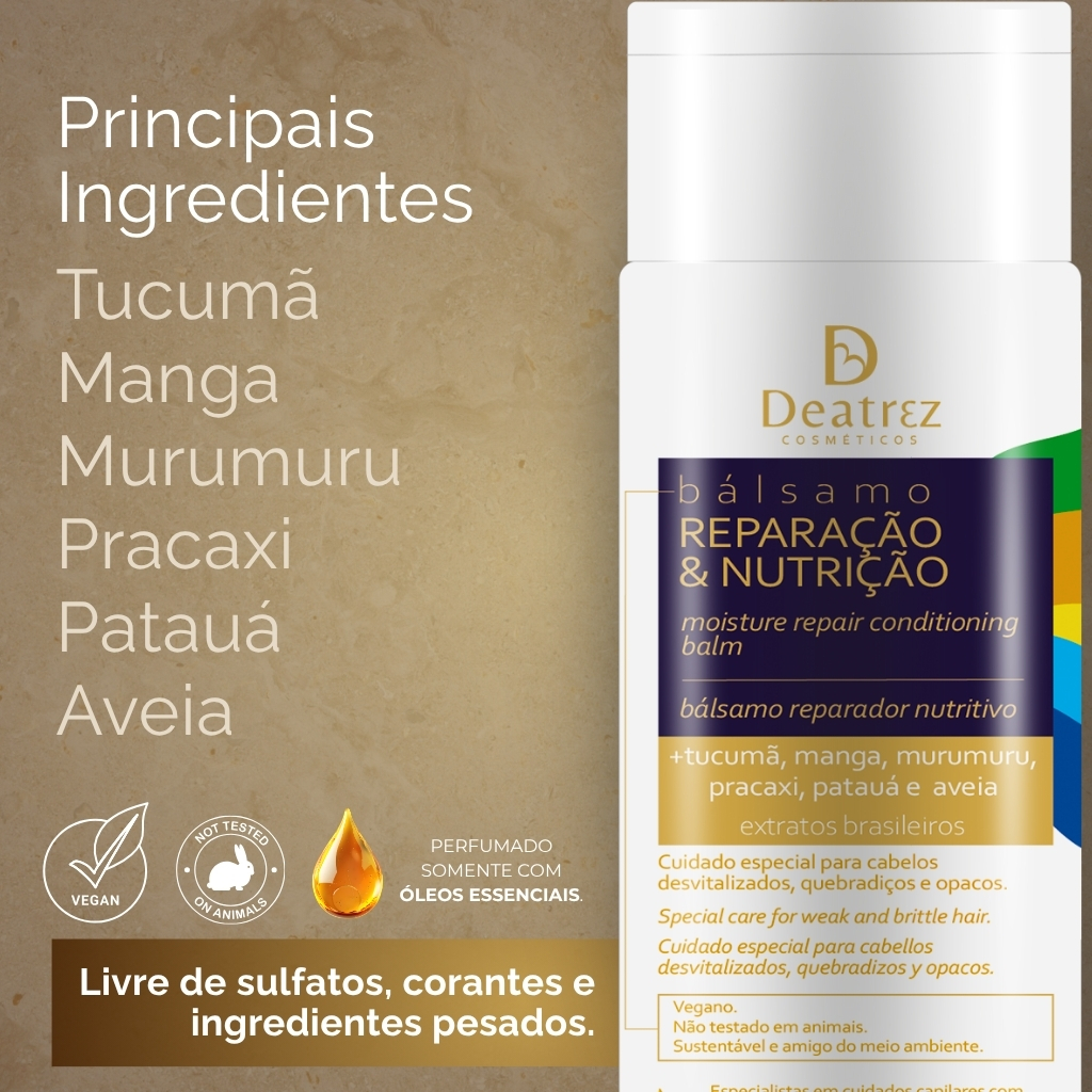 O Bálsamo Reparação e Nutrição é o agente especial na reposição nutritiva e reparação capilar. Composto com ingredientes brasileiros: tucumã, manga, murumuru, pracaxi, patauá e aveia, promove restauração profunda, penetrando na fibra capilar, repondo nutrientes essenciais, combatendo a porosidade e restaurando a maciez . Com 91% de ingredientes naturais.Para uma experiência completa, o bálsamo conta com um blend exclusivo de óleos essenciais de Cedro, Lemongrass, Lavanda, Palmarosa, Ylang Ylang e Gerânio — que perfumam delicadamente e criam uma sinergia com os ativos naturais, potencializando seus efeitos e promovendo equilíbrio entre cuidado e bem-estar. Atua ainda no fortalecimento da raiz e controle da oleosidade. O resultado dá aos fios toque sedoso, brilho intenso e força duradoura.